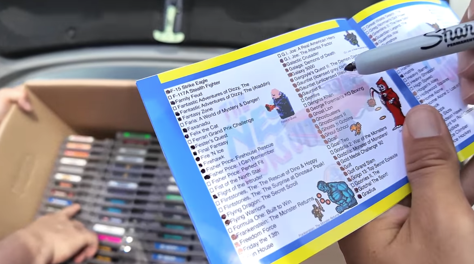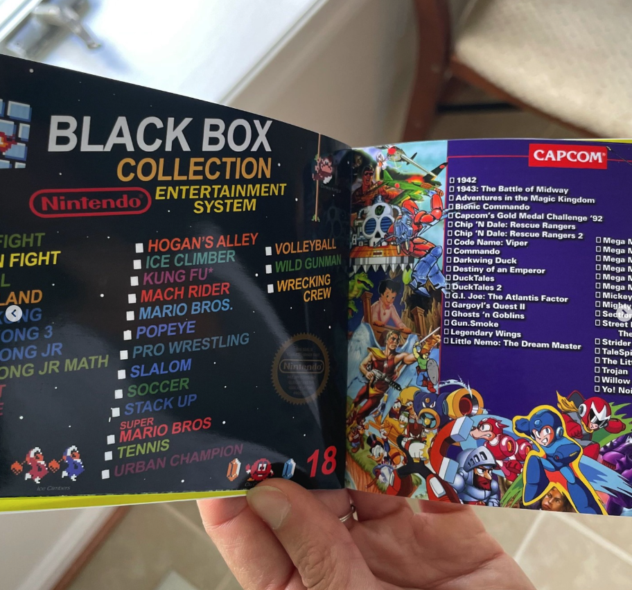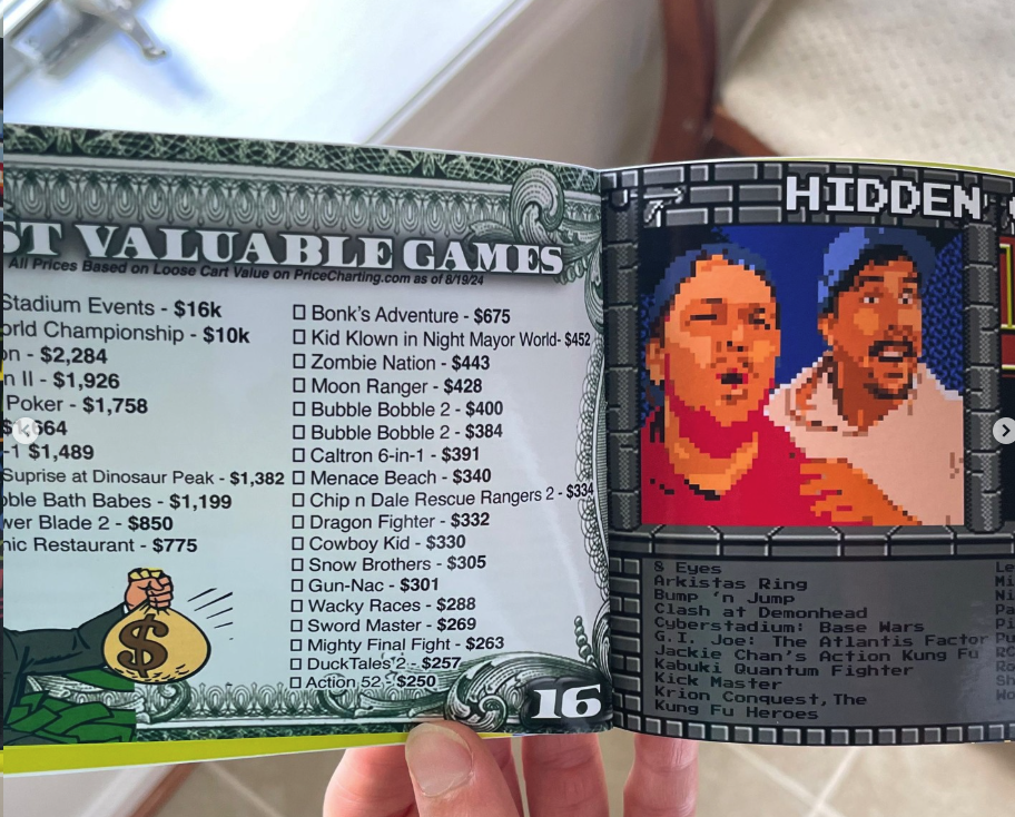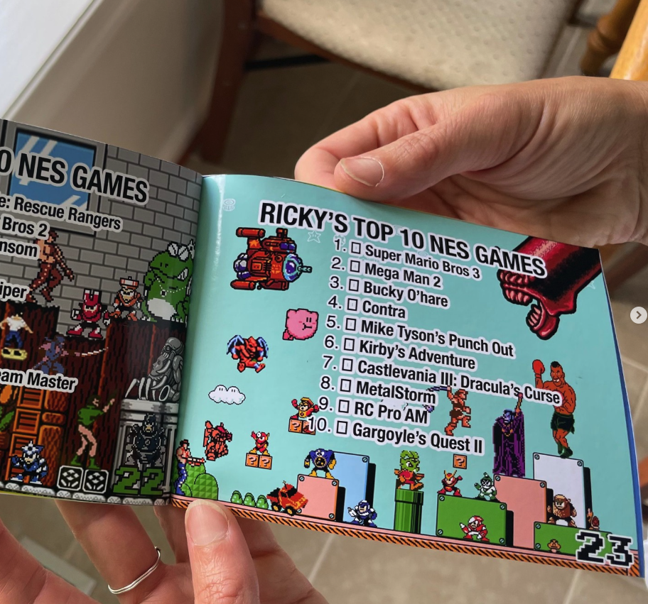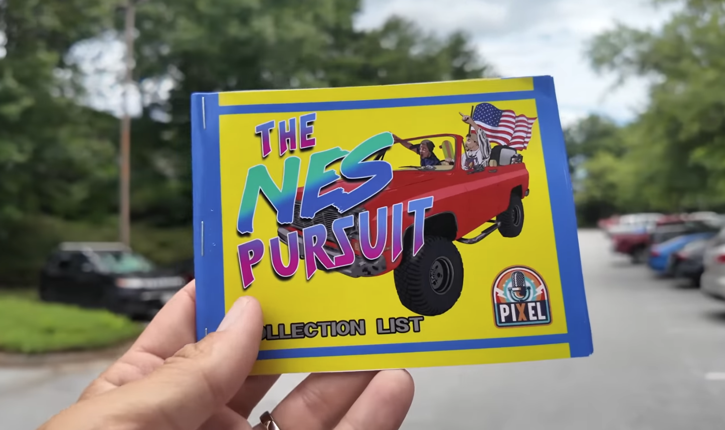 The NES Collection Checklist that the Pixel Game Squad used to track their NES Pursuit to full collection. The booklet includes all official NES releases in an organized checklist with game art from various NES games. There are also bonus pages in the back that show more specific groups of games such as Capcom, Konami, Nintendo Black Box releases, Riff and Ricky’s Top 10 games and more.